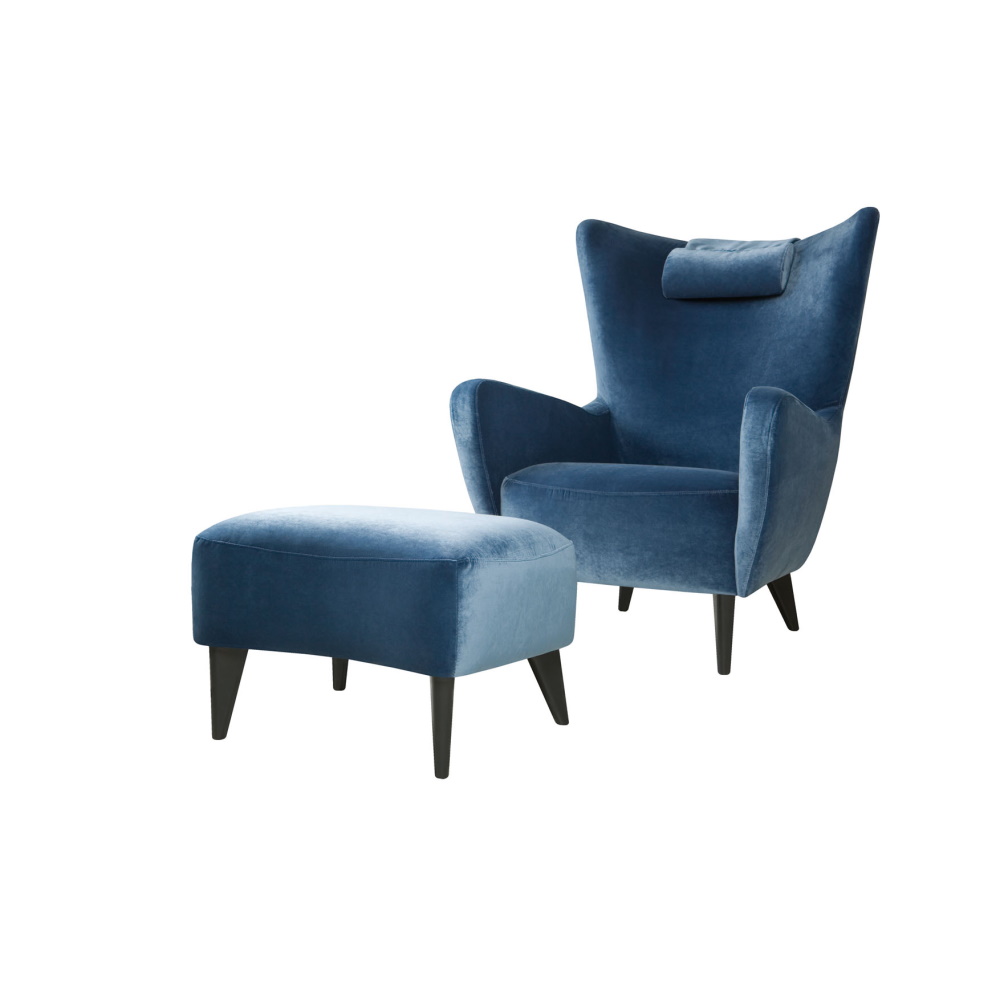 A timeless appearance will never go out of style. Elsa is a contender for the easy-chair Hall of Fame because of her ideal proportions and simple, but distinctively formed armrests. A neckrest pillow adds to the slender shape, as do the high, thin wooden legs. Remember to include the foot stool!